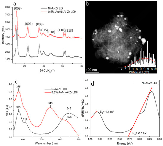 (a) Comparative X-ray diffractograms of the Ni-Al-Zr LDH (in black) and 0.5% Au/Ni-Al-Zr LDH (in red). (b) TEM micrograph in dark field of the 0.5% Au/Ni-Al-Zr LDH and the gold particle size distribution. (c) Comparison of the absorbance spectra of the Ni-Al-Zr LDH (in black) and the 0.5% Au/Ni-Al-Zr LDH (in red) (diffuse reflectance measured with an integration sphere). (d) Kubelka–Munk plot of the Ni-Al-Zr pristine material, assuming indirect allowed transition.