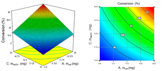 The quantity of the catalyst was the second most important factor, having also a positive effect (+14.09). Lastly, our results underlined that the reaction time and H2O2 quantity were not influencing factors. The most important interaction worth mentioning was that occurring between the weight of the NaOH and the catalyst (+8.75). Examining surface plots as a function of two factors while maintaining constant values of others is an effective method for determining the relationship between a reaction condition and a conversion yield as a response. Figure 3 provides three-dimensional and contour plots regarding the effect of the most significant two-factor interactions (AC, weights of the NaOH and catalyst) on the yield of glucose conversion, confirming the positive effect of both factors.