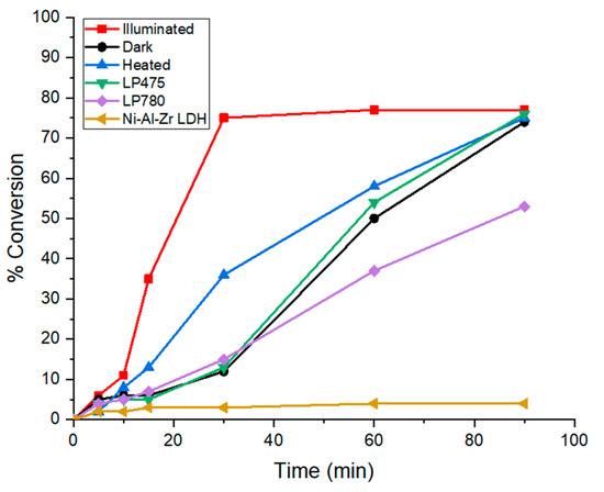 Simultaneously to the factorial experiments, we observed a noticeable variation when standardized illumination or dark conditions were used at room temperature. To decipher if a light-induced mechanism was herein involved, the reaction was deliberately conducted in the dark (Figure 4, black curve). Compared to the darkness, it was clear that in the presence of light (Figure 4, red curve), a much faster reaction was observed, reaching a maximum of 77% conversion yield within only 30 min vs. 74% conversion yield after 90 min in darkness. This first comparative result stressed the contribution of incident light in accelerating the kinetics of glucose oxidation, and therefore, it emphasized the photocatalytic nature of the reaction. Nevertheless, after 90 min of continuous illumination, the reaction medium temperature reached 35 °C. To confirm the photocatalytic hypothesis and also to rule out any heat-induced activation for this reaction, a similar reaction was conducted in the dark at a temperature of 35 °C. As shown in Figure 4 (blue curve), the kinetic enhancement by temperature remained marginal, thus excluding any thermal effect.