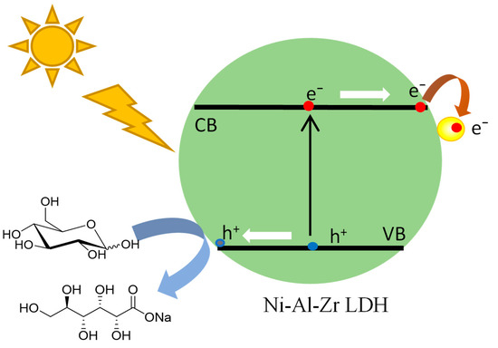 In conclusion, a charge-driven transfer process starting from the excitation of the LDH to the supported gold nanoparticles was evidenced by this bundle of results (Figure 5). As evidenced by the reaction made without H2O2, which resulted in no reaction, the latter served as an electron scavenger after the injection of electrons from the conduction band of the LDH into the gold. This electron-scavenging process enhanced the charge separation lifetime, consistent with previous observations in the literature [24,47,48,49], thereby preventing the undesired rapid radiative recombination processes. This electron transfer resulted in the formation of ·OH oxidant radicals and HO⁻ anions, which also prevented the poisoning of the gold catalyst by the as obtained gluconic acid. This mechanism knowledge will help to design new materials with tunable bandgaps of the support, allowing for better harvesting of the light and, thus, a better efficiency for the selective transformation of free carbohydrates.