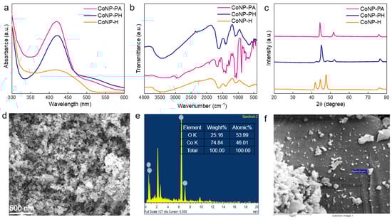 Figure 1a displays ultraviolet-visible (UV–vis) absorption spectra of the cobalt particles synthesized from malic acid-treated polyamide, polyhydrazide, and hydrazide. For convenience, the samples were designated as CoNP-PA, CoNP-PH, and CoNP-H for polyamide, polyhydrazide, and hydrazide-mediated cobalt particles. The peak at 419 nm in the CoNP-PA sample points to the presence of cobalt particles. In contrast, the high absorption peak indicates a higher concentration of the particles in a solution with fair dispersion. For the CoNP-PH sample, the peak was slightly red-shifted (423 nm) relative to the CoNP-PA and it indicates that there was a difference in the size distribution or the surface environment of the CoNPs after polyhydrazide treatment. For the CoNP-H sample, the absorption intensity was further reduced, which might be due to poor dispersion. This implies a different attachment of cobalt particles to the hydrazide-treated metal particles sample. The primary peaks for all samples were within the range of 390–450 nm, characteristic of cobalt particles’ surface plasmon resonance (SPR) []. Fourier-transform infrared (FTIR) analysis was performed to recognize the various functional groups present in CoNP-PA, CoNP-PH, and CoNP-H samples, as shown in Figure 1b. The different functional groups can contribute to the synthesis, capping, and stabilization of particles []. The spectra exhibited similar peaks, with minor shifts and peak broadening observed in the polymer-mediated particles. A notable peak at 3450 cm−1 is characteristic of the hydroxyl group found in phenolic compounds. Additional significant peaks were observed at 1620 cm−1, 1375 cm−1, 1078 cm−1, and 533 cm−1, corresponding to the carbonyl group, amide group, C–O stretch of alcohols or phenols, and cobalt particles, respectively. Figure 1c shows the XRD measurements for each of the three samples (CoNP-PA, CoNP-PH, and CoNP-H). The formation of CoO identified by the strong diffraction peaks at 45°, 52°, and 76° matched well with the plane of (111), (200), and (220) of cubic phase particles (JCPDS:42-14670). XRD analysis revealed that the synthesized samples consisted of an undefined mixture of oxides, indicating the absence of a phase-pure oxide. The XRD patterns of the produced cobalt particles showed considerable modifications, including the disappearance of certain peaks and the introduction of other signals, indicating the formation of mixed oxide phases rather than a single-phase material. These differences are not simply attributable to the effect of the stabilizing agents, as XRD offers bulk structural information and is not very surface-sensitive. Instead, the changes were most likely caused by variations in nucleation and growth processes under varied synthesis conditions, which resulted in the production of undefined crystalline mixes. This structural complexity underscores the importance of carefully controlling reaction conditions in order to generate consistent and well-defined phase compositions. More research, such as improved structural characterization techniques, is needed to completely understand and optimize the formation process. Pure cobalt particles usually form in a spherical shape, according to earlier research []. The majority of the cobalt particles were spherical, as shown in Figure 1d, while a tiny percentage formed dendritic patterns that resembled flowers. Conversely, the sample exhibited cobalt particles with a pronounced dendritic morphology resembling leaves. Only the Co and O peaks were visible in the EDX spectrum with 74.84 wt.% of Co and 25.16 wt.% of O (Figure 1e,f). The spectrum once more demonstrated the pure cobalt and oxygen in the configuration of this nanostructure.