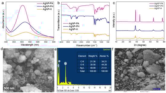Figure 2a displays the absorption spectra of the Ag particles produced from malic acid-treated polyamide, polyhydrazide, and hydrazide. The existence of AgNP was corroborated by the absorption peak position at 405 nm for AgNP-PA, 421 nm for Ag-PH, and 425 nm for AgNP-H samples. The intensity of the peak absorbance was lower in the AgNP-H samples as compared to the other two samples. However, the peak position indicated the subsistence of AgNP, and the relatively low intensity may indicate a lesser concentration or smaller size of the particles. Therefore, a high concentration of the produced silver particles was indicated by a high absorbance level, particularly in the AgNP-PA sample. All of the samples exhibited a peak in the 400–450 nm range, which corresponds to the usual silver particle surface plasmon resonance (SPR) []. This suggests that all of the samples included silver particles. The variations in peak intensities signified the variations in the treatments adopted in the formation of these particles. AgNP-PA was implied to form the most efficient and concentrated of the silver particles, as AgNP-PA > AgNP-PH > AgNP-H. It was also observed that the size distribution of the relevant particles could be obtained by utilizing the width of the peaks. Sharp peaks indicate a more constrained size range of the particles, whereas larger peaks indicate a wider particle size distribution. The AgNP-PA spectrum showed a more narrow and higher peak, indicating a more uniform and strongly condensed distribution of particles. The IR spectra of AgNP-PA, AgNP-PH, and AgNP-H are shown in Figure 2b. The precise IR characteristic vibration peak for AgNP-PA was identified to be at 1432 cm−1 which corresponds to NH bending vibration, 2836 cm−1 for CH2 extension, 3247 cm−1 for N-H stretching, and 590 cm−1 for N-H bending vibrations. The obtained vibrational peak of the amine group was quite close to that of the literature but shifted a little downward due to the manifestation of AgNPs at the PA surface, indicating that Ag NPs might have had some physical interaction with the amine group. Further, a peak at 557 cm−1 was assigned to the existence of Ag particles. In the case of the AgNP-PH sample, the IR peaks of silver particles were observed at 440 cm−1 and 509 cm−1. This slight variation in peak positioning can be attributed probably to the surface plasmon resonance of the AgNP []. The AgNP-H spectrum was similar to the AgNP-PH spectrum with fewer functional groups, suggesting less complex surface chemistry from the hydrazide treatment. However, AgNP-PA demonstrated a broad and complex spectrum with numerous functional groups, specifying a diverse surface chemistry from the polyamide treatment. The crystalline structure and phase composition of pre-synthesized silver particles are shown in Figure 2c. Following the standard reference (JCPDS No: 03-0931), the XRD pattern shows four different diffraction peaks at around 38°, 44°, 64°, and 77°. These peaks correspond to the (111), (200), (220), and (311) crystal planes. The face-centered cubic (fcc) structure of the produced silver particles indicated that the silver nitrate precursor was efficiently reduced by the addition of polyamide/polyhydrazide and hydrazide, resulting in the formation of crystalline Ag NPs. This SEM image exhibited silver particles synthesized using malic acid-treated polymers and silver nitrate, as shown in Figure 2d. Particles of different sizes seemed to be clustered together to produce a rough, porous structure. According to the scale bar, the typical particle size appeared to be in the nanometer range. These particles may have had a large surface area, as shown by the agglomeration, which might be advantageous for catalysis and other applications requiring high reactivity. Additionally, the varied particle shapes and irregular surface morphology indicate that the synthesis process likely produced a mixture of particle sizes and shapes, potentially due to the influence of malic acid-treated polymers in the reaction environment. The EDX spectrum indicated the presence of carbon (C), oxygen (O), and silver (Ag) with 21.36 wt.% of C, 30.56 wt.% of O, and 48.08 wt.% of Ag, respectively, as shown in Figure 2e,f. The presence of carbon and oxygen was likely due to the organic components from the malic acid-treated polymers used in synthesis, as well as any organic residues or stabilizers remaining on the particles. Ag particles, characterized by narrow SPR peaks and uniform size, are well-suited for biomedical applications such as antimicrobial agents or in sensing technologies.