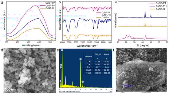 UV–visible absorption spectra of the synthesized copper particles are depicted in Figure 3a. The prompt and broad absorption maxima at 565 nm for CuNP-PA, 590 nm for CuNP-PH, and 582 nm for CuNP-H samples confirmed the surface plasmon resonance of copper colloids. The intense surface plasmon band was evidence of the formation of non-oxidized copper particles. The slight red shift and low absorption intensity in polyhydrazide and hydrazide-based samples suggested a variation in particle sizes or formation of the aggregation states. Figure 3b shows the IR spectra of Cu particles synthesized from malic acid-treated polyamide, polyhydrazide, and hydrazide. For the CuNP-PA sample, the broad peak was noted~3500 cm−1 and can be attributed to O-H stretching vibrations due to the presence of hydroxyl groups. The peak at 2912 cm−1 fitted well with C-H stretching vibrations. Similarly, the peaks~1648 cm−1 corresponded to C=O stretching vibrations that may imply that the compound contains carbonyl groups. The peaks from 1500–1000 cm−1 were attributed to the C-N stretching mode of amines or amides. The peaks below 1000 cm−1 displayed Cu-O bonds linked together, affirming the incorporation of the copper particles in the composites. For all three samples (CuNP-PA, CuNP-PH, and CuNP-H), peaks around 600–500 cm−1 were likely due to the Cu-O stretching vibrations. These peaks confirmed the presence of copper–oxygen bonds, suggesting the incorporation of copper particles in the composites. In the CuNP-H sample, the additional peaks at 500–400 cm−1 likely corresponded to further Cu-O interactions or lattice vibrations associated with copper oxide, reinforcing the presence of copper particles. Also, for the CuNP-PH sample, a broad peak around 3560 cm−1 for O-H stretching vibration similar to CuNP-PA was observed again. The additional peaks below 1000 cm−1 indicated the presence of copper particles. The CuNP-H peaks due to C-N stretching down to the range of 1650–1575 cm−1 comparable to the other samples and peaks below 1000 cm−1 revealed Cu particles in the sample. All the samples exhibited a diffuse band around 3500 cm−1 due to the presence of the OH group, which can be used as a capping or stabilizing agent. Specifically, the IR spectra of all samples showed copper particles in all samples with similar functional groups as capping and stabilizing agents crucial for the formation and stability of the particles. The XRD patterns of the CuNP-H, CuNP-PH, and CuNP-PA particles are shown in Figure 3d. At 19° and 23°, the CuNP-PA showed distinctive α-crystal peaks. Furthermore, as indicated by JCPDS No: 85-1326, the XRD peaks at 43° and 50° corresponded to the (111) and (200) planes, respectively, demonstrating the synthesis of Cu particles in the CuNP-PH and CuNP-H samples. The obtained structures were a mixture of oxides and not phase-pure materials. We can see a significant level of particle aggregation in this SEM image of Cu particles (Figure 3d). The particles were dispersed over the viewed area and appear as clusters of different sizes. Although some particles showed slight variations because of potential overlapping or aggregation, the morphology appeared to be spherical overall. This agglomeration may have resulted from particles’ inherent tendency to cluster in order to reduce surface energy. Like many other metallic particles, Cu particles frequently agglomerate unless an appropriate matrix or capping agent stabilizes them. Such agglomerations can affect characteristics including stability, surface area, and catalytic activity. Cu has a weight percentage of 53.04% and an atomic percentage of 22.27%, resulting in the primary peak in the EDX spectrum (Figure 3e,f). As would be predicted for copper particles, this verified that copper was the main component. The organic molecules utilized in the production process were probably the source of the carbon, which may indicate some surface passivation by the organic polymer to help stabilize the particles against further oxidation. Additionally, titanium was found. It may have been a result of contamination during the synthesis process, or it may have been a precursor or substrate material. The excellent integration of copper particles was confirmed by this elemental composition study, which also showed signs of surface oxidation and stabilization from the organic matrix obtained from malic acid. The uniform morphology of Cu nanoparticles also highlights their potential in electronic devices or as catalysts in organic transformations.