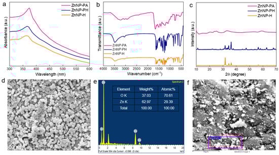 The absorption spectra of Zn particles with polyamide, polyhydrazide, and hydrazide are displayed in Figure 4a. The spectra of ZnNP-PA, ZnNP-PH, and ZnNP-H helped to probe the effective surface modification of Zn NPs. The ZnNP-PA, ZnNP-PH, and ZnNP-H samples exhibited sharp absorption peaks at 374 nm, 367 nm, and 365 nm, respectively. All Zn particles exhibited absorbance peaks in the range 350–375 nm due to facilitated charge transfer at the coordinated sites. The slight blue shift in ZnNP-PH and ZnNP-H samples can probably be ascribed to the decrease in particle sizes and the nature of the interaction of hydrazides with ZnO lattice sites. The IR spectra of ZnNP-PA, ZnNP-PH, and ZnNP-H samples are displayed in Figure 4b. The hydroxyl groups present at the surface of ZnO particles were responsible for the absorption band at 3477 cm−1. Four new, unique bands of absorption were revealed at 3031 cm−1, 1648 cm−1, 1475 cm−1, and 1210 cm−1. The double carbon–carbon bonds in aromatic rings, the carbon–oxygen link, and the aromatic CH groups were represented by these bands, in that order []. Additionally, a distinct absorption band at 1558 cm−1 was noted. This band was connected to the stretching vibration of the polymer chain carbon–carbon double bond. The carbonyl group absorption band in the IR spectra appeared at about 1660 cm−1 as a result of the amide group stretching vibration. Furthermore, Zn-O in the polymer structure was the basis of the absorption band at 537 cm−1 []. The XRD patterns of ZnNP synthesized from PA, PH, and H are shown in Figure 4c. The (100), (002), and (101) planes of ZnO are represented by the 2θ peaks in the XRD pattern for ZnNP-PH, and ZnNP-H, which are located at about 31°, 34°, and 36°, respectively (JCPDS-36-1451) []. When comparing the Zn-PA pattern, a shift in peaks was seen, most likely as a result of variations in the lattice properties. The existence of Zn particles is verified in both patterns despite this change. The XRD patterns further confirmed that the synthesized samples were composed of an undefined mixture of oxides, indicating that phase purity was not achieved. The Zn particles appeared to be uniformly distributed with generally spherical morphology, though some showed slight agglomeration, as manifested in Figure 4d. The surface texture suggests a high density of particles with varied sizes, potentially indicating a mixture of particle sizes or slight polydispersity. This morphology is typical for particles synthesized in polymer matrices, where the polymer can influence particle size and distribution. The relatively uniform particle distribution suggested effective stabilization by the malic acid-treated polymer, which likely helped control the nucleation and growth of the zinc particles. The elemental composition of Zn particles confirmed the presence of Zn with high weight concentration of 62.97%, as shown in Figure 4e,f.