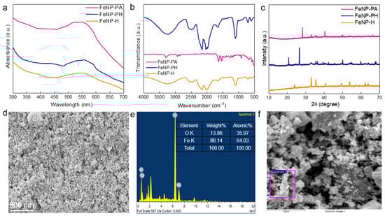 Figure 5a shows the absorption spectra of iron particles synthesized from malic acid-treated polyamide, polyhydrazide, and hydrazide. The absorption intensity of FeNP-PA was found to be higher than in other samples. The higher absorption intensity can be noted due to the formation of smaller particle sizes with polyamide. The larger surface area of iron particles contributed to the enhanced absorption. Briefly, effective protection against harmful UV radiation damage is ensured by the integration of iron particles into the polymer matrix. The IR spectra of FeNP-PA, FeNP-PH, and FeNP-H particles are shown in Figure 5b. Fe–O stretching was indicated by a significant enlargement of peaks in the FeNP-PA spectra around the 400–700 cm−1 absorption bands. The existence of iron particles was confirmed by the peak at 566 cm−1, and amide stretching was responsible for the peak at 908 cm−1. FeNP-PH spectra demonstrated these peaks at 581 cm−1 and 692 cm−1. These peaks aligned with the bending and stretching vibrations of the Fe-O bonds assigned to the magnetite phase of the crystal lattice. Furthermore, there was a transitory, sharp peak at 1096 cm−1 in the FeNP-PH and FeNP-H spectra. Additionally, a large O-H stretching band at 3214 cm-1 was displayed by the polyhydrazide and hydrazide particles, showing the presence of O-H groups from the alcohol or water utilized. The O-H bending absorption band at 1640 cm−1 imparted further explanation for the presence of water. Finally, the hydroxyl group in Fe NPs was suggested by the C-O stretching absorption bands at 1087 cm−1, certainly due to the use of ethanol and water before drying. The crystalline nature of Fe particles was examined by XRD analysis, as shown in Figure 5d. In the XRD data of the as-synthesized samples FeNP-PA, FeNP-PH, and FeNP-H, the diffraction peaks may be ascribed to the different phases of iron oxide including hematite, magnetite, maghemite, and FeO particles, at different peak positions, respectively. The PH and H-based Fe NPs samples also show a peak around 22° because of the polymer network []. The SEM image in Figure 5d shows iron particles synthesized from malic acid-treated polymer and an iron precursor, exhibiting a rough, granular morphology with particles clustered in aggregates. The scale bar (500 nm) suggests that individual particle sizes were likely below 100 nm, though they were densely packed, forming larger aggregates. The rough texture may have been due to the influence of the polyamide matrix and malic acid treatment, possibly enhancing the surface area, which is favorable for catalytic or adsorption applications. The particle distribution appeared moderately uniform, although some aggregation was present, which might indicate partial oxidation or agglomeration during synthesis. This morphology suggests that the synthesis method successfully produced nanoscale particles with characteristics potentially suitable for applications requiring high surface area and reactivity. Iron (Fe) and oxygen (O) were represented by the two main peaks, with iron making up the bulk at 88.14% by weight and 64.03% by atomic percentage, and oxygen making up 13.86% by weight and 35.97% by atomic percentage, as depicted in Figure 5e,f. The sample was predominantly composed of iron particles, as confirmed by the high iron content. However, the presence of oxygen indicated partial oxidation, which was likely to generate iron oxide on the surfaces of the particles. This oxidation may have resulted from the iron particles’ frequent contact with air during production or preservation. For instance, the mixed-phase composition of Zn and Fe nanoparticles suggests potential utility in catalysis and environmental remediation due to their redox activity and stability.