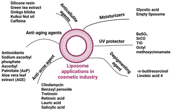 The cosmetics industry faces many challenges, especially when boosting the permeation of cosmetically active compounds (CACs) through the skin is an issue. Their physicochemical properties, such as the size and solubility in fats or water, significantly influence the permeation ability. Nanotechnology presents new opportunities to enhance skin permeation, although further research is required to ensure safety and efficiency of the employed nanomaterials. In this context, using liposomes as carriers may not only help overcome the skin barrier and but also improve the bioavailability of CACs. Liposomes are nanometric self-assembling vesicles composed of phospholipids. In an aqueous solution, the phospholipids (consisting of a hydrophilic head and a hydrophobic tail) concentrate the hydrophilic heads toward the aqueous medium, thus forming double layers surrounding the aqueous core [3]. Due to their biocompatibility, non-toxicity, and morphological similarity to living cell membranes, liposomes have been widely used in products intended for use on the skin. Their structure allows for the effective delivery of active ingredients into the deeper layers of the epidermis while protecting them from degradation, increasing their stability and efficacy. The introduction of the first liposomal antiaging cream under the Christian Dior brand in 1986 triggered intensive research of new liposomal formulations [4]. Today, the cosmetic industry successfully uses liposomes in various products, including moisturizing, wrinkle-reducing, antiaging, UV protecting, depigmenting, and anti-acne formulations (Figure 1) [5].