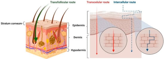- Transfollicular transport (through hair follicles and sebaceous gland mouths)—A highly permeable pathway following a transepithelial route. It is used to transport polar or ionizable compounds and large macromolecules, which have difficulty passing through the epidermal cells due to their size and different partitioning properties. However, given that appendages occupy only 0.1% of the total skin surface, they account for a deficient proportion of the total transport of compounds through the skin [22,23].