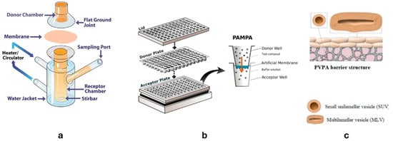 Schemes of (a) a Franz diffusion cell [41]; (b) Skin-PAMPA [42]; and (c) PVPA barrier [43].