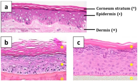 Comparison of a histological cross-section of (a) in vivo human skin, (b) EpiSkin, and (c) EpiDerm [57].