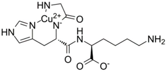 Peptides are popular cosmetic ingredients as they immediately improve the appearance of the skin by moisturizing and conditioning its surface layer and exhibit additionally various biological effects. GHK (glycyl-L-histidyl-L-lysine) is a small, naturally occurring tripeptide with a high affinity toward the copper cation (Figure 6) [64]. The GHK tripeptide was first isolated in 1973 from human plasma by Loren Pickart and has been thereafter the subject of continuous research.