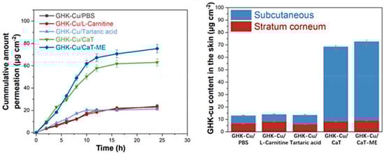 Although the GHK–Cu complex seems a “trendy” cosmetic component, its skin permeation has not been thoroughly characterized. So far, most tests have been performed using Franz or Flynn diffusion cells. Mazurowska and Mojski [68] studied the migration rate of GHK–Cu through the membrane imitating the stratum corneum to evaluate the ligand’s effect on copper permeation. The determined permeability coefficients confirmed that complexation boosts the permeation rate of copper ions. In a study by Hostynek et al., three different layers of skin from human cadavers (isolated stratum corneum, isolated epidermis, and dermatomed skin) were employed to portray the penetration of GHK–Cu as a potential anti-inflammatory agent [69]. The amount of copper passing through the individual layers was measured, and the retention was in the range of 0.6–2.8%. Liu et al. [70] developed a carrier based on an ionic liquid (IL) composed of betaine and tartaric acid, in which they encapsulated GHK–Cu and investigated its permeation through mice skin and its retention in its various layers. The presented results confirm that the IL enhances the ability of GHK–Cu to penetrate the skin and holds promise to improve its efficacy for applications like skin regeneration or antiaging treatments. In a follow-up report of the same group [71], a thermodynamically stable IL-based microemulsion (CaT-ME) was designed to better the transport of GHK–Cu across the skin barrier. The data shown in Figure 7 demonstrate that the parent IL (i.e., CaT) and, particularly, the microemulsion enable significantly better penetration of GHK–Cu than other systems such as L-carnitine or tartaric acid.