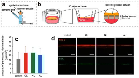 The scheme of (a) FDS and (b) 3D skin model experiments. Traces (c) and (d) show, respectively, the results of FDS experiments (24 h) and CLSM images of a cross-section of 3D skin treated with labeled liposomes. Legend: CLSM = confocal laser scanning microscopy; CL = cationic liposomes; NL = neutral liposomes; AL = anionic liposomes [74].