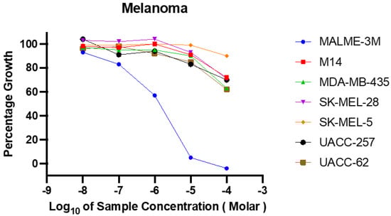Consistent with the results of the one-dose assay, LA demonstrated potent cytotoxicity, with particularly high sensitivity observed against the Malme-3M cell line, which showed over 75% mean cell death (Figure 1). The calculated mean Log10 GI50 (growth inhibitory power 50) value for LA against the Malme-3M cell line was −5.86 mol/L, the Log10 TGI (total growth inhibition) was −4.45 mol/L, and the Log10 LC50 (lethal concentration 50) was >−4.0 mol/L. The most potent BRAF, MEK, and ERK inhibitors showed a mean GI50 value of –6.5 mol/L (0.32 μM), while the least potent inhibitor showed a mean GI50 value of –4.35 mol/L (45 μM) [27]. The heightened sensitivity for LA against the Malme-3M cell line is likely due to the BRAF V600E mutation, with a wild-type NRAS high occurrence in this cell line, whereas other melanoma lines harboring NRAS mutations may activate alternate pathways like PI3K-Akt to bypass the inhibition of the MAPK signaling pathway [28,29]. The microscopic images of the Malme-3M cell line treated with various LA concentrations showed a clear dose-dependent inhibition of cell growth and proliferation (Supplementary Figure S2). The images reveal a reduction in cell numbers and morphology changes in time and dose-dependent manners, which is consistent with the LA NCI cytotoxicity.