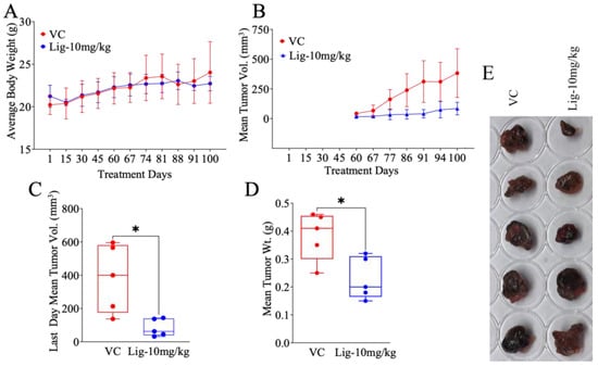 Following the potent in vitro results against Malme-3M melanoma cells, we further investigated LA in vivo antitumor efficacy using a nude mouse xenograft model. Ten female nude mice were subcutaneously xenografted Malme-3M cells, as detailed in the Materials and Methods section. After nearly 60 days of initial tumor cell xenografting, the mice tumors averaged 50 mm3. Mice were then randomly assigned into two groups, namely (i) vehicle control and (ii) LA treatment, with n = 5 each. The treatment group were administered LA orally daily using an oral gavage at a dose of 10 mg/kg in 100 μL vehicle control (VC, 0.1% v/v sterile DMSO in sterile PBS). The other group were administered VC. The treatments continued for an additional 40 days. All mice were sacrificed at the end of the study, and the tumors and organs were collected, weighed, and sectioned.