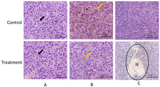 A histopathological study of representative hematoxylin and eosin (H&E)-stained sections of collected Malme-3M tumors from VC- and LA-treated nude mice. (A) Images showing the presence of nuclear pseudoinclusions (black arrows) and (B) melanin pigments (yellow arrows) in both VC- and LA-treated tumor sections (40× objective, 400×). (C) The detection of focal necrosis areas in LA-treated Malme-3M tumors, not found in VC-treated tumor sections. N: Focal necrosis area (10× objective 100×).