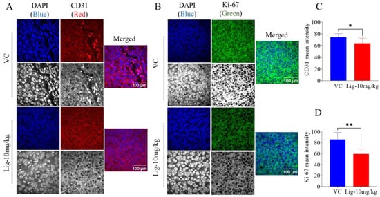 Immunofluorescence results showed a notable reduction in the expression levels of the proliferation marker ki67 and the vasculogenesis marker CD31 in LA-treated Malme-3M tumor sections, unlike the VC-treated tumors (Figure 4). This clearly justifies LA’s effective antiproliferative activity and potential for potent angiogenesis suppression in Malme-3M tumors.