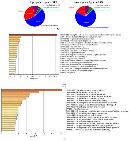 A comparative analysis of VC- versus LA-treated tumors revealed the significant dysregulation of 583 genes out of 21,448 genes, with a log2 fold change threshold of >2 or <−2 [36]. Of these, 348 genes were upregulated, while 235 genes were downregulated in response to LA treatment. Approximately 56.03% of the upregulated genes were derived from multiple complexes, with 28.45% representing coding genes (Figure 5A, left). For the downregulated genes, nearly 69.79% originated from multiple complexes, while 16.17% were coding genes (Figure 5A, right).