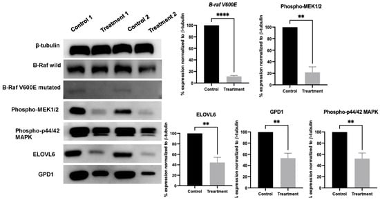A Western blot Analysis of tumor lysates from control and ligstroside aglycone (LA)-treated groups: expression levels of BRAF wild-type (BRAF WT), phosphorylated MEK (p-MEK), phosphorylated MAPK (p-MAPK), glycerol-3-phosphate dehydrogenase 1 (GPD1), and elongation of very long-chain fatty acid 6 (ELOVL6). β-tubulin was used as the loading control. Densitometric values were normalized to β-tubulin. Student’s t-test was used, where ** p < 0.01, and **** p < 0.0001 indicate statistical significance. Vertical bar graphs indicate the normalized integrated optical density for bands visualized in each lane.