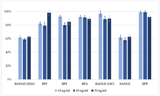 In previous studies [20,28], preliminary experiments were conducted to optimize the DLLME-based extraction conditions for bisphenols from biological samples, specifically human breast milk and amniotic fluid. This optimization involved adjusting the types, volumes, and ratios of solvents used. All experiments were performed using the well-characterized DLLME-based extraction procedure as described in a previous study by Szubartowski and Tuzimski [20]. The flowchart of the final procedure is presented in the Materials and Methods section. The DLLME-based extraction procedure demonstrated strong performance across all analytes, with recovery rates ranging from 62 to 98% and relative standard deviations (RSD) below 6% (Figure 1).