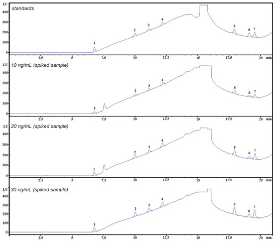Example chromatograms obtained during the HPLC–FLD analysis: mixture of bisphenol standards (25 ng/mL) and three spiked samples at 10 ng/mL, 20 ng/mL, and 30 ng/mL. 1—BADGE∙2H2O, 2—BPF, 3—BPE, 4—BPA, 5—BADGE∙2HCl, 6—BADGE, 7—BPP.