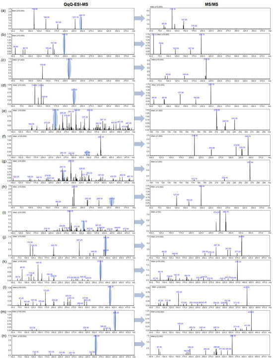 QqQ–ESI–MS and MS/MS spectra of following bisphenols residues detected in pericardial fluid samples: (a) BPS (m/z = 249), (b) BPF (m/z = 199), (c) BPE (m/z = 213), (d) BPA (m/z = 227), (e) BPB (m/z = 241), (f) BPP (m/z = 345), (g) BPZ (m/z = 267), (h) BPAF (m/z = 335), (i) BPAP (m/z = 335), (j) BADGE•2H2O (m/z = 394), (k) BADGE•H2O (m/z = 376), (l) BADGE•H2O•HCl (m/z = 412), (m) BADGE•2HCl (m/z = 430), and (n) BADGE (m/z = 358).