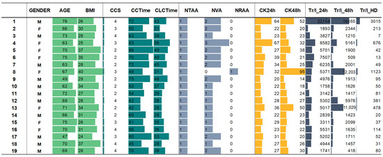 Regarding the PCA (Figure 8B), patients were divided into three main, observable groups. Samples No. 8, 18, and 19 were arbitrarily positioned in the plot, suggesting differences from other patients. Patient No. 8, in particular, is notable for having the highest levels of creatinine kinase as well as high levels of troponin I 48 h post-surgery. This patient is further distinguished from other patients by the presence of radial artery anastomoses (NRAA) and the absence of venous anastomoses (NVA).