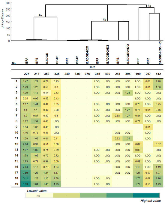 The hierarchical clustering model revealed the formation of three main clusters: BPA, BPE, BADGE, and BPAP were found in all investigated samples except for samples 8, 9, and 10 (#a); the group of BPS, BPAF, BADGE•H2O, BADGE•2HCl, and BPP were not detected in all samples or detected at the LOQ level (#b); and the BPB, BADGE•2H2O, BPF, BPZ, and BADGE•H2O•HCl were selectively detected in the samples (#c).