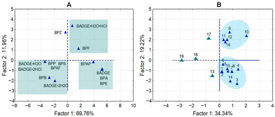The PCA components (Figure 6A) accounted for approximately 69% of the total variance in bisphenol distribution. The clustering of bisphenols shows a clear distinction and reflects a similar concentration distribution. Regarding the PCA (Figure 6B), two main groups of patients were observed. Samples No. 13, 17, 18, and 19 were arbitrarily plotted in the plot, highlighting a difference between these samples and the others.