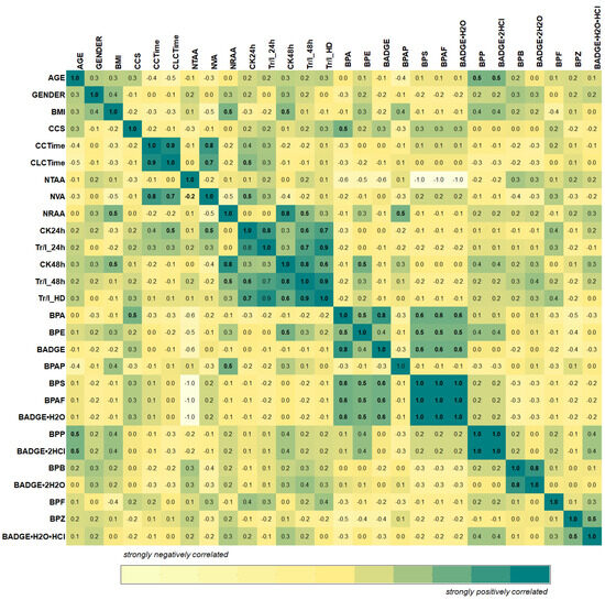 Creatinine kinase and troponin I values determined at 48 h post-surgery are correlated with BMI. A similarity between BPAP levels and the number of radial artery anastomoses (NRAA) (r ≥ 0.5) was also observed. The heat map revealed a correlation (r = 0.5) between central cord syndrome (CCS) and bisphenol A (BPA).