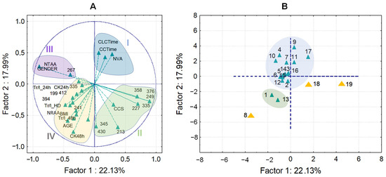 PCA score plots for clinical data and quantified bisphenols referred to 19 patients (A) and the scatter plot for patients (B) with coronary artery diseases. The numbers plotted in (A) represent the m/z of bisphenols while the numbers plotted in (B) represent the patients name. 227—BPA, 249—BPS, 241—BPB, 199—BPF, 345—BPP, 213—BPE, 267—BPZ, 335—BPAP, BPAF—335, 358—BADGE, 376—BADGE•H2O, 394—BADGE•2H2O, 412—BADGE•H2O•HCl, and 430—BADGE•2HCl. CCS/central cord syndrome; CCTime/circulation time (min); CLCTime/clamp cap time (min); NTAA/No. of thoracic artery anastomoses; NVA/No. of venous anastomoses; NRAA/No. of radial artery anastomoses; CK24h/creatinine kinase (U/L), 24 h after the surgency; CK48h/creatinine kinase (U/L), 48 h after the surgency; Tr/I_24h/Troponin I (ng/L), 24 h after the surgency; Tr/I_48h/Troponin I (ng/L), 48 h after the surgency; Tr/I_HD/Troponin I (ng/L), Hospital discharge data.