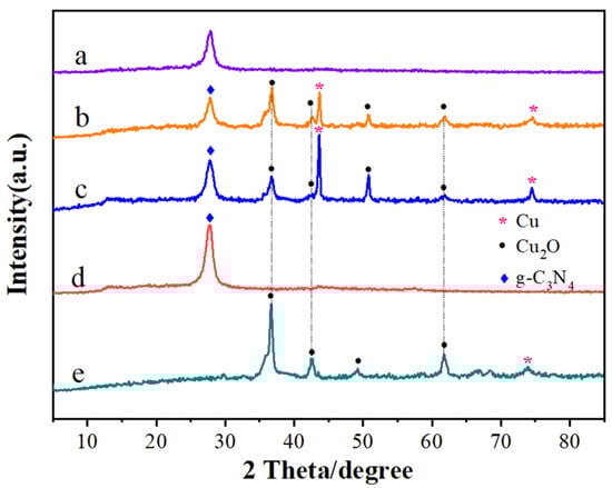 XRD patterns of the sample: (a) g-C3N4 nanosheets, (b) 50% Cu-Cu2O/g-C3N4, (c) 30% Cu-Cu2O/g-C3N4, (d) 5% Cu-Cu2O/g-C3N4, (e) Cu-Cu2O.