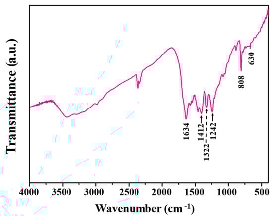 The chemical composition of 30% Cu-Cu2O/g-C3N4 was further investigated by FT-IR measurements. The as-obtained spectrum is shown in Figure 2; it can be observed that there is a wide peak at 3000~3500 cm−1, which corresponds to the stretching vibration of N-H and the surface-absorbed water. In addition, the characteristic peaks at 1242, 1322, 1412, and 1634 cm−1 are ascribed to the stretching vibration of CN heterocycles. Moreover, the band at 808 cm−1 is attributed to the breaching mode of the s-triazine ring system [31]. As compared to pure g-C3N4, a new peak at 630 cm−1, which corresponds to the Cu (I)–O bond stretching vibration of Cu2O, has emerged [32]. These results indicated the presence of Cu2O and g-C3N4 in the Cu-Cu2O/g-C3N4 sample. However, no peak matching with the Cu nanoparticles could be found in the spectrum; this may be a result of the non-active properties of Cu0 in the infrared spectrum.