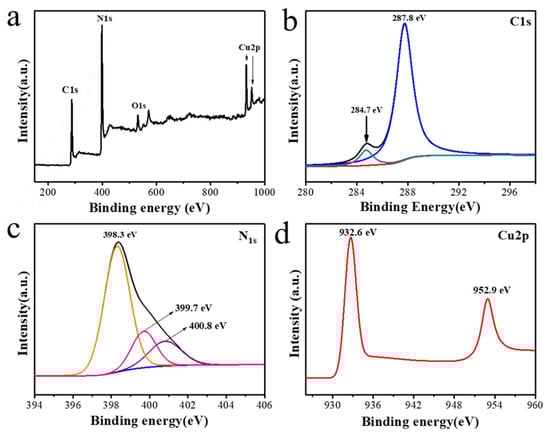 XPS spectra of 30% Cu-Cu2O/g-C3N4. (a) Survey spectrum, (b) C 1s, (c) N 1s, (d) Cu 2p.