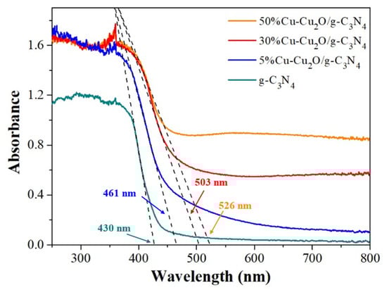 UV–Vis diffuse reflection spectra (DRS) were used to illustrate the optical properties of the as-prepared samples (Figure 4). According to previous publications, g-C3N4 possessed an absorption edge of 460 nm, matching the band gap of 2.70 eV [28]. As can be seen in Figure 4, the absorption edges of g-C3N4, 5%, 30%, and 50% Cu-Cu2O/g-C3N4 are 430, 461, 503, and 526 nm, respectively; thus, the bandgap energies can be calculated to be 2.88, 2.69, 2.47, and 2.36 eV [28]. Compared with the pure g-C3N4, the absorption spectra of the composite samples exhibited an obvious red shift, indicating that the absorption of the heterostructures in the visible light range was enhanced. In addition, with the increased content of Cu-Cu2O, the intensity of the absorption peak for the sample was improved. The enhanced photo-response ability might be attributed to the localized surface plasmon resonance (LSPR) of the Cu nanoparticles and the strong light absorption nature of Cu2O. Overall, the Cu-Cu2O/g-C3N4 composites exhibited stronger visible light absorption performances than the pristine g-C3N4 and gradually increased with the content of Cu-Cu2O.