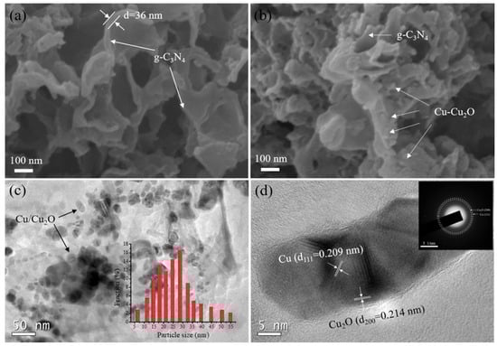The morphology and microstructure of the as-prepared samples are characterized by SEM and TEM measurements (Figure 5). Pure g-C3N4, showing a lamellar structure with a thickness of the sheet of ~36 nm, is clearly observed (Figure 5a); after deposition of the copper oxide nanoparticles, the surface of g-C3N4 becomes rough, and discrete “dots” on the surface can be seen (Figure 5b). The TEM technique gives more evidence on the dispersion of the copper oxide on g-C3N4 nanosheets, and the size distribution of this copper oxide is mainly in the range of 15–35 nm (inset in Figure 5c). Further HR-TEM analysis was performed to make the nature of these anchored nanoparticles clear, as shown in Figure 5d. Two different lattice spacings of 0.2088 nm and 0.2135 nm could be determined from the single particle (Figure 5d); the former one is ascribed to the (111) crystallographic plane of Cu metal and the latter one corresponds to the (200) crystallographic of the Cu2O species. In addition, the SAED pattern in the inset of Figure 5d also confirmed the crystal information of the as-prepared ternary heterostructures. Besides this, a close interface between g-C3N4 and Cu-Cu2O could be observed in the Cu-Cu2O/g-C3N4 nanostructures. It is well-accepted that tight contact is beneficial for charge transfer and promotes the photogenerated charge separation in the Cu-Cu2O/g-C3N4 heterostructures [36].