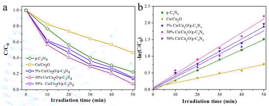 RhB degradation over the different catalysts in the presence of H2O2 under visible light irradiation for pure g-C3N4 nanosheets, Cu-Cu2O, without catalyst, 5% Cu-Cu2O/g-C3N4, 30% Cu-Cu2O/g-C3N4, and 50% Cu-Cu2O/g-C3N4 (a), and their kinetic plots (b).