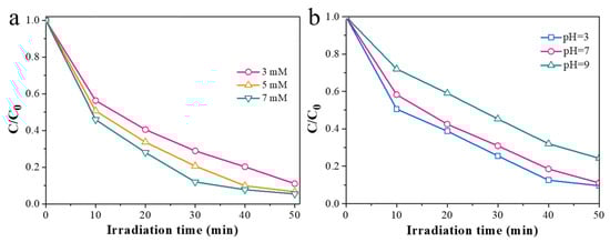 The effects of H2O2 dosage and pH value on the catalytic performance of 30% Cu-Cu2O/g-C3N4 were further studied. It can be observed in Figure 8a that only 10% of RhB was degraded after a reaction of 50 min in the absence of H2O2. When H2O2 was added, the degradation efficiency of RhB over the ternary samples was improved. Specifically, the degradation efficiency of RhB reached 90% when the content of H2O2 was at a low level (about 3 mM), and the degradation efficiency reached about 99% when the content of H2O2 increased to a medium level (about 5 mM). However, when the amount of H2O2 was more than 5 mM, the removal rate of RhB increased slightly since the H2O2 would act as a self-scavenger for ·OH. Figure 8b shows the effect of initial pH on RhB degradation in a 30% Cu-Cu2O/g-C3N4 photocatalytic system with 5 mM H2O2. As shown in Figure 8b, only a small drop-in degradation rate over the catalyst can be observed when the initial pH values ascended from 3 to 7. However, when the initial pH increased from 9, the degradation efficiency of RhB over the sample decreased dramatically. Generally speaking, in acidic conditions, a large number of H+ exists in the solution ions and it would promote the generation of ·OH, while in basic solution, OH− ions could inhibit the formation of ·OH and further result in the decomposition of H2O2 to water and oxygen, thus resulting in the decrease in degradation efficiency [9,37].