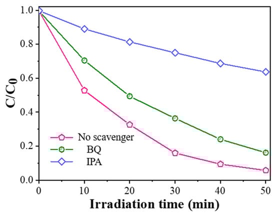 To further clarify the nature of the photo-Fenton photocatalytic process, the trapping experiments were used to explore the main active species. Different trapping reagents of isopropyl alcohol (IPA) and benzoquinone (BQ) were used to selectively react with the free radicals of ·OH and ·O2−, respectively. As shown in Figure 9, it is observed that the IPA affects the degradation much more compared to that of BQ, with a larger inhibition effect and a lower degradation rate of 36.3%, indicating that the main active species in the photo-Fenton reaction process are hydroxyl radicals.