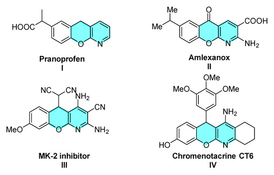 As a representative fused heterocyclic scaffold, pyranoisoquinoline derivatives are ubiquitous in bioactive compounds and natural products. For instance (Figure 1), Pranoprofen (I) and Amlexanox (II) are marketed anti-inflammatory drugs [1,2]. Compound III inhibits mitogen-activated protein kinase 2 (MK-2) and suppresses expression of TNFa in U937 cells [3]. Compound IV has potential activity for the treatment of Alzheimer’s disease [4].