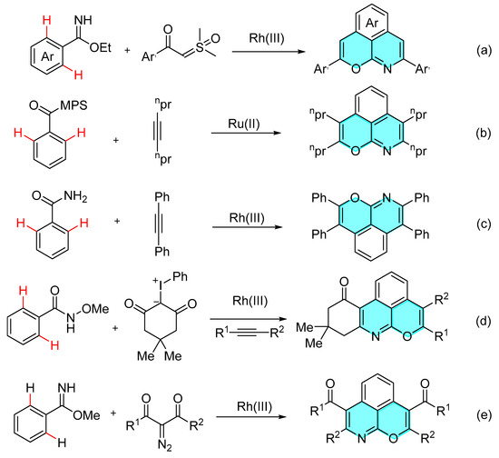 - Shankar, M.; Ghosh, K.; Mukherjee, K.; Rit, R.K.; Sahoo, A.K. One-pot unsymmetrical {[4 + 2] and [4 + 2]} double annulations of o/o′-C−H bonds of arenes: Access to unusual pyranoisoquinolines. Org. Lett. 2018, 20, 5144–5148. [Google Scholar] [CrossRef]