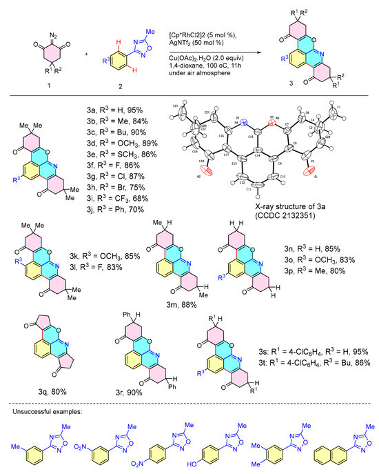 The interaction range of oxadiazole 2 with cyclic diazo compounds was examined under optimal conditions (Scheme 3). Typically, substrate 2 with both electron-donating (Me, Bu, OMe, and SMe) and electron-absorbing groups (F, Cl, and Br) was successfully converted to the desired chromopyridine products 3a–3h in good yields (75–95%). When R3 was CF3 or Ph, the corresponding yields of products 3i and 3j were 68% and 70%, respectively. In addition, the reaction of oxadiazoles with cyclic diazonium compounds yielded 3k and 3l in 85% and 83% yields when the oxadiazole interstitials were linked to the substituted OMe and F. The reaction of different types of diazonium compounds with oxadiazole 2 also proceeded well, giving the target products 3m–3t in 80–95% yields. Single-crystal characterization determined the structure of 3a [14]. However, 3-phenyl-1,2,4-oxadiazole with other substituents could not give the desired product in this reaction. Due to the steric exclusion of the 3-phenyl-1,2,4-oxadiazole substituent group, the insertion of the diazo compound in the neighboring position was prevented, which is not conducive to the formation of Rh-carbene.
