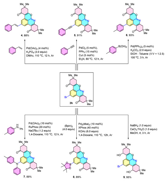 A Schlenk tube was equipped with a magnetic stir bar and charged with 2-bromo-6,6,11,11-tetramethyl-6,7,11,12-tetrahydrochromeno[2,3,4-gh]phenanthridine-4,13(5H,10H)-dione 3h (0.1 mmol), NaBH4 (1.0 equiv), CeCl3·7H2O (1.0 equiv), and MeOH (2 mL). Then, the flask was sealed under Ar and stirred at rt for 3 h. After the reaction was quenched by the addition of water, the mixture was extracted with dichloromethane, and the combined organic layer was dried over sodium sulfate. The concentration in vacuo followed by silica gel column purification with petroleum ether/ethyl acetate eluent gave the desired product 9.