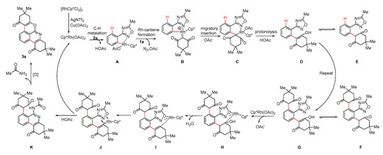 Based on the experimental results and literature reports, a possible reaction mechanism was proposed in Scheme 6. Initially, [Cp*RhCl2]2 undergoes anion exchange in the presence of AgNTf2 and Cu(OAc)2·H2O to generate a Rh(III)-active catalyst. The active catalyst and substrate 2a were activated by the C-H bond to form a five-membered rhodium ring as intermediate A. Subsequently, the cyclic 2-diazo-1,3-diketone 1a coordinates with intermediate A to form intermediate B by releasing N2. Then, migratory insertion of carbine into Rh-C bond completes the C-C coupling and affords the six-membered intermediate C, which can be protonated with acetic acid to generate intermediate D and release the Rh(III)-catalyst. Intermediate E is an isomer of intermediate D. Repeating the above steps, intermediate G was obtained. Intermediate F is an isomer of intermediate G. Intermediate G coordinates with the Rh(III)-active substance to generate intermediate H. Intermediate H undergoes an elimination reaction to eliminate H2O and obtain intermediate I. The Rh remains trivalent throughout and does not undergo a valence state change. Cu does not participate in the reaction in this process. Subsequently, intermediate I undergoes electron transfer to generate intermediate J [11,12,13]. In addition, complex J undergoes reductive elimination to form the C-N bond to generate complex K and generate Rh(I). Rh(I) is reoxidized to Rh(III) in the next catalytic cycle using the N-O bond cleavage as the internal oxidant [10,11,15]. Intermediate K undergoes oxidation by Cu(OAc)2·H2O followed by an intramolecular nucleophilic addition reaction to produce the desired product 3a [16].