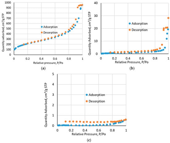 The isotherms plots are presented in Figure 2. Low-temperature nitrogen adsorption/desorption measurements showed that the BET surface area of the sorbent Amberlite XAD-16 was 777.10 m2/g and the pore size was 1.4755 cm3/g before impregnation. For impregnated Amberlite XAD-16—TBP (1:2), it decreased to 2.41 m2/g and 0.0436 cm3/g, respectively. The results for Amberlite XAD-16—TBP (1:3) showed that the BET surface area was 0.16 m2/g and the pore size was 0.000931 cm3/g, indicating that the sorbent pores are completely filled. It proved that the impregnation process has taken place.