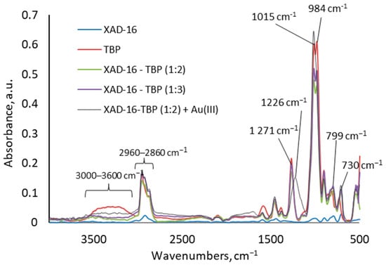 FTIR-ATR spectra for Amberlite XAD-16 before impregnation, the extractant TBP, and the impregnated sorbents: Amberlite XAD-16—TBP (1:2) and Amberlite XAD-16—TBP (1:3).