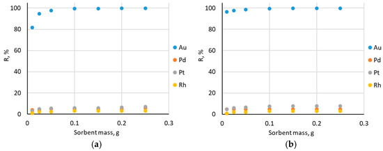 Influence of the sorbent mass was been studied. The impregnated sorbents masses of 0.01, 0.025, 0.05, 0.1, 0.15, 0.2, and 0.25 g were weighed and contacted with 25 mL of precious metals solution (10 mg/L of Au(III), Pd(II), Pt(IV), and Rh(III)) at 6 M HCl. Then, the samples were shaken for 24 h in a laboratory shaker.