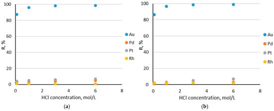 The effect of the HCl concentration on the recovery percentage of the precious metal ions were studied. The results of the Au(III), Pd(II), Pt(IV), and Rh(III) ions sorption in the HCl concentration range, i.e., 0.1, 1, 3, and 6 M, are presented in Figure 5.