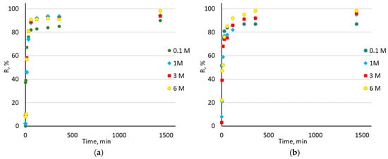 Au(III), Pd(II), Pt(IV), and Rh(III) solutions (10 mg/L of each element) at different HCl concentrations, i.e., 0.1, 1, 3, and 6 M, were prepared. Moreover, 0.2 g of each sorbent was contacted with 50 mL of the solutions and the samples were shaken in the laboratory shaker Elpin 358A (Elpin, Lubawa, Poland). After a specific time (1, 5, 15, 30, 60, 120, 240, 360, and 1440 min), the samples were taken.