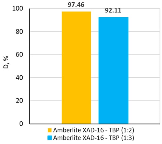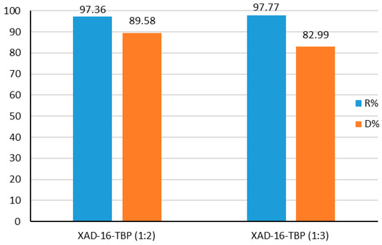 After sorption of Au(III) ions from the resulting solution, a desorption process was performed using 1 M HCl/1 M TU as a desorbing agent. The desorption percentage are presented in Figure 9. The results show high values of %D for the impregnated sorbents—89.58% for Amberlite XAD-16—TBP (1:2) and 82.99% for Amberlite XAD-16—TBP (1:3). It proved that the prepared sorbents can be useful in the recovery of Au(III) ions from the real leaching solutions.