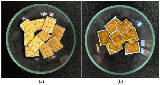 Chips from the smart cards: (a) before leaching; (b) after leaching.